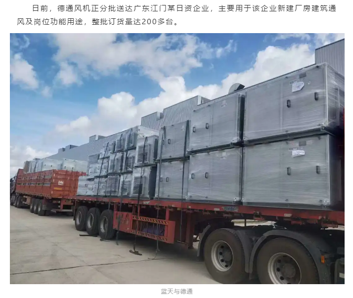 2. 日前,德通風(fēng)機(jī)正分批送達(dá)廣東江門(mén)某日資企業(yè),主要用于該企業(yè)新建廠房建筑通風(fēng)及崗位功能用途,整批訂貨量達(dá)200多臺(tái)。...