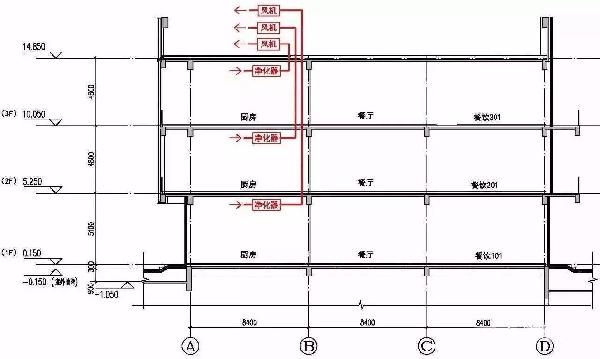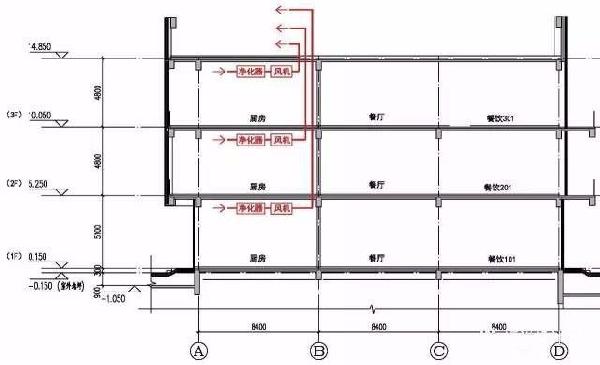 每家餐飲用戶均獨立設(shè)置一套油煙系統(tǒng),各個用戶之間不合用油煙風(fēng)管、油煙風(fēng)機(jī)、凈化器。油煙風(fēng)機(jī)可設(shè)置于餐飲單元的廚房吊頂內(nèi),也可設(shè)置于屋面。