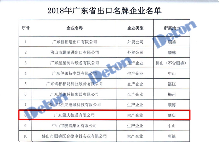 10月23日下午,在廣東商務(wù)廳的指導下,“2018年度廣東省出口名牌企業(yè)發(fā)布推介會”在廣交會展館舉行,會上,主辦方發(fā)布了廣東省出口名牌企業(yè)名單,據(jù)悉,經(jīng)申報材料資格審查、20多位行業(yè)專家評定、公開征求意見等多項環(huán)節(jié),廣東省共有79家企業(yè)被認定為“2018年度廣東省出口名牌企業(yè)”,德通公司便是其中之一,該評定每年評審一次,德通已經(jīng)連續(xù)多年獲得此殊榮。